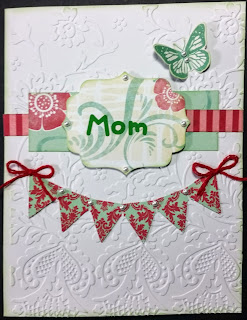 I made this for Mother's Day and sent it to my mom. I think the papers are Teresa Collins. I could be wrong though. I embossed a white card base with an Anna Griffin embossing folder, added tiny pearls and embroidery floss bows to the banner, pearls to the butterfly and bent the wings up. Sometimes I forget less is more. Miles of Smiles,